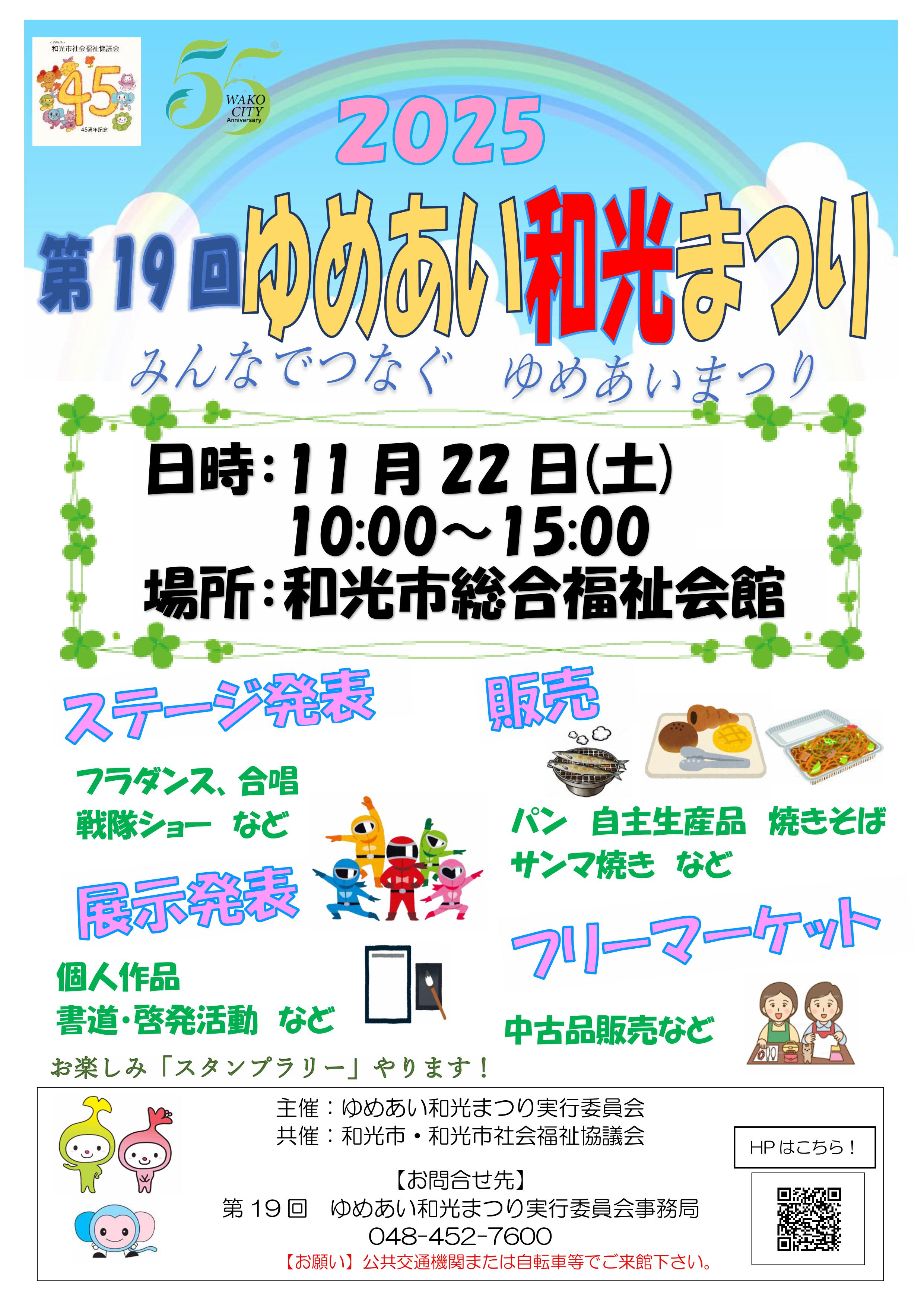 今年度も和光市総合福祉会館にて第19回ゆめあい和光まつりを開催します。