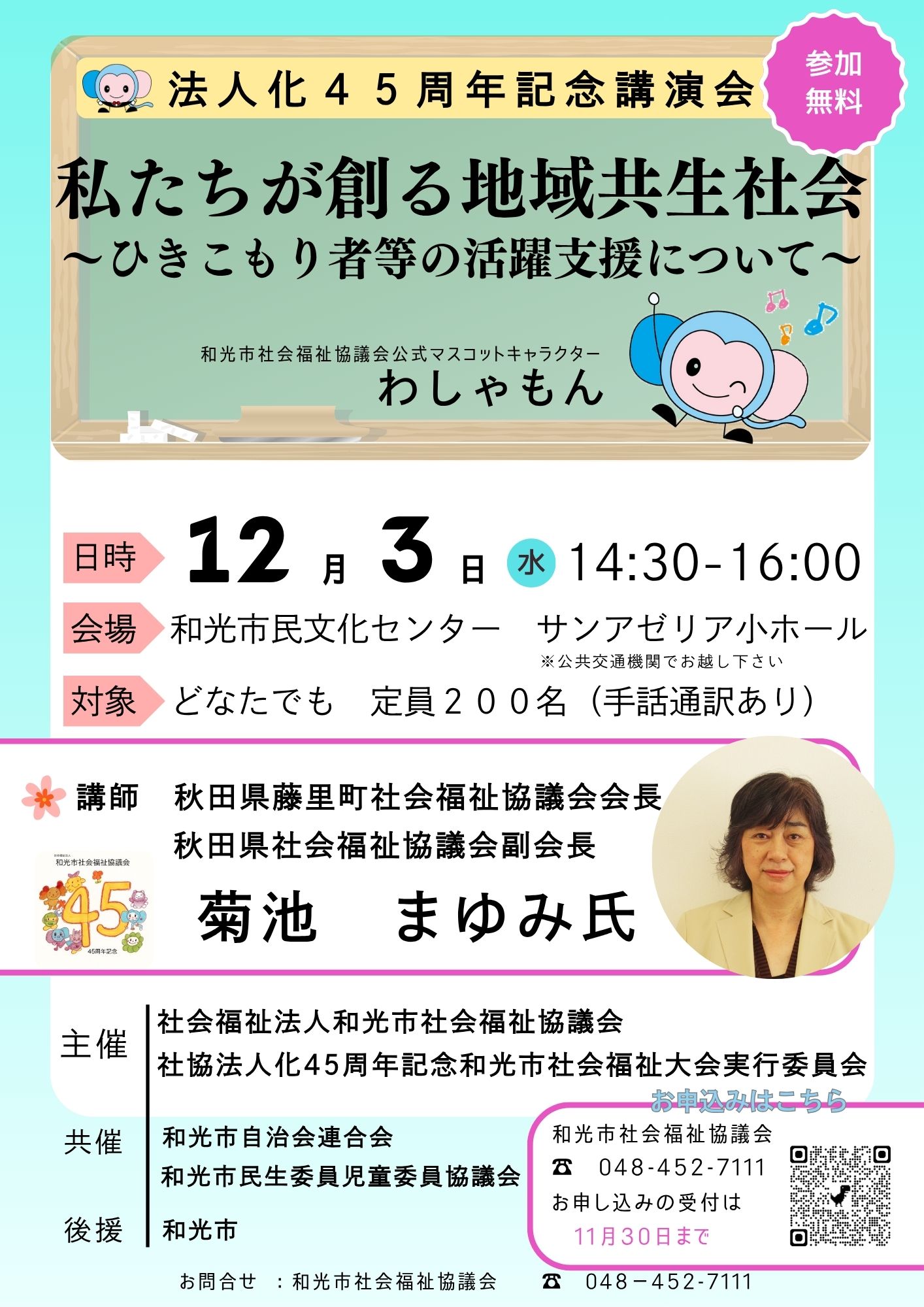 和光市社会福祉協議会法人化45周年を記念し、秋田県藤里町社会福祉協議会会長の菊池まゆみ氏をお招きし、記念講演会を行います。ぜひご参加ください。